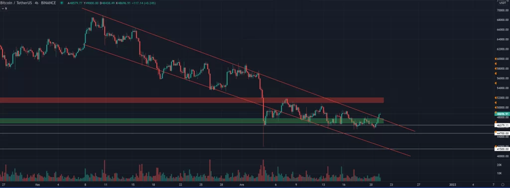 Özellikle kırmızı destek kanalında tutunan BTC’nin alt tarafı kırmayıp buradan yükseliş yaşayarak trendin üstünü kırması, minör trendde yükseliş sinyalinin geldiğini gösteriyor. Eğer haftalık olarak da 49.000 dolar üzerinde bir kapanış gelebilirse büyük resimde de işlerin olumlu hale döndüğünü söyleyebiliriz.