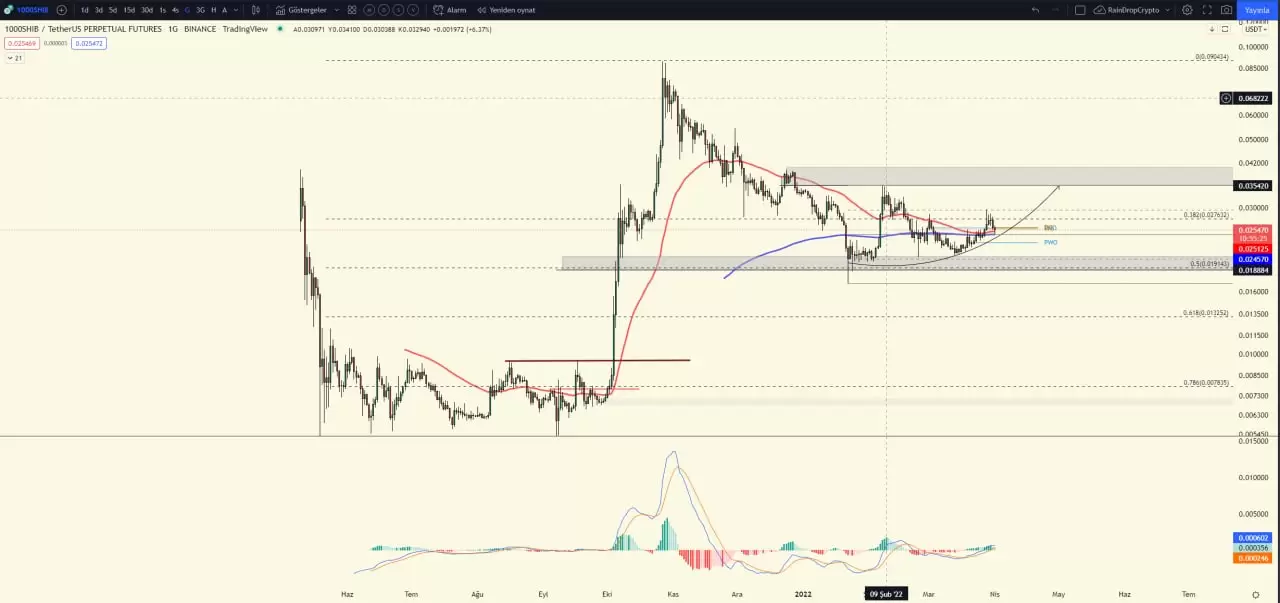 Aynı zamanda gerçekleşmek üzere olan EMA 50 ve 200 kesişiminden destek alarak düşen trendi yukarı yönlü kırmaya hazırlanırken fib 0.382 denk gelen 0.027 dolar üzerine çıkamadan red gelmiş olup bu bölgenin önemli bir direnç noktası olduğu görülmektedir.