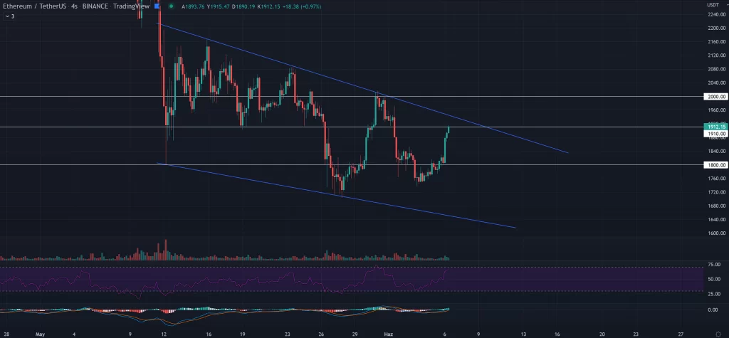 ETH grafiğine baktığımızda ise en önemli direnç seviyesinin mavi trend çizgisi olduğu görülüyor. Özellikle ETH’nin bu mavi alan üzerinde 4 saat ve üzerine kapanışlar yapması yükselişlerin devamı için oldukça önemli.