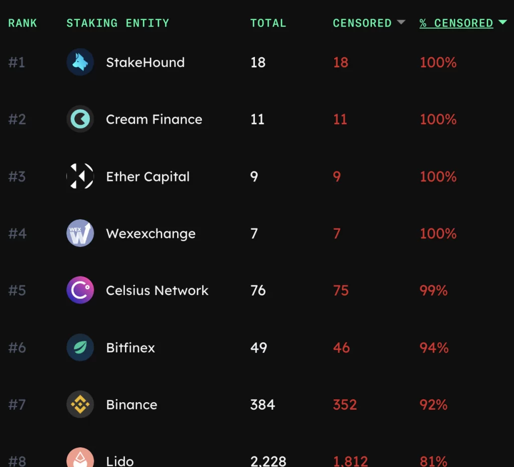 OFAC kurallarına uyan en büyük kripto şirketleri arasında StakeHound, Cream Finance, Ether Capital, Celsius, Bitfinex ve Binance gibi devler bulunuyor.