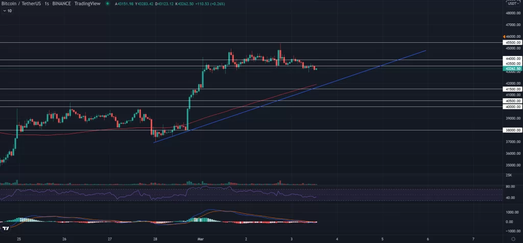 Şu an için saatlik grafikte 42.500 dolara yakın noktada bulunan destek de hala aktif ve BTC fiyatı 43.000 dolar ila 42.500 dolar arasında yatay seyredebilir.