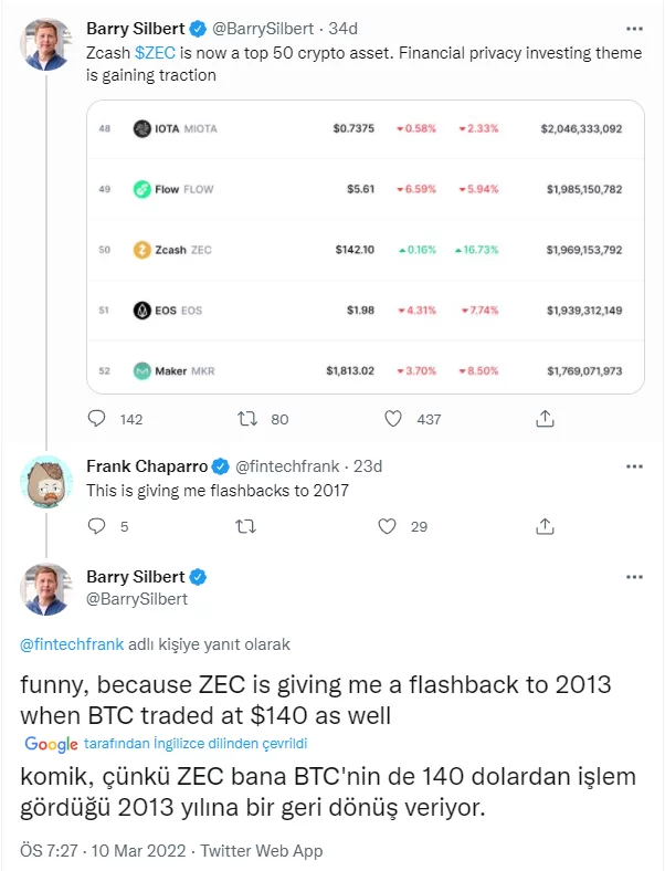 Bu yoruma kayıtsız kalmayan Silbert, “Komik. Çünkü ZEC bana Bitcoin’in 140 dolardan işlem gördüğü 2013 yılını hatırlatıyor.” dedi.