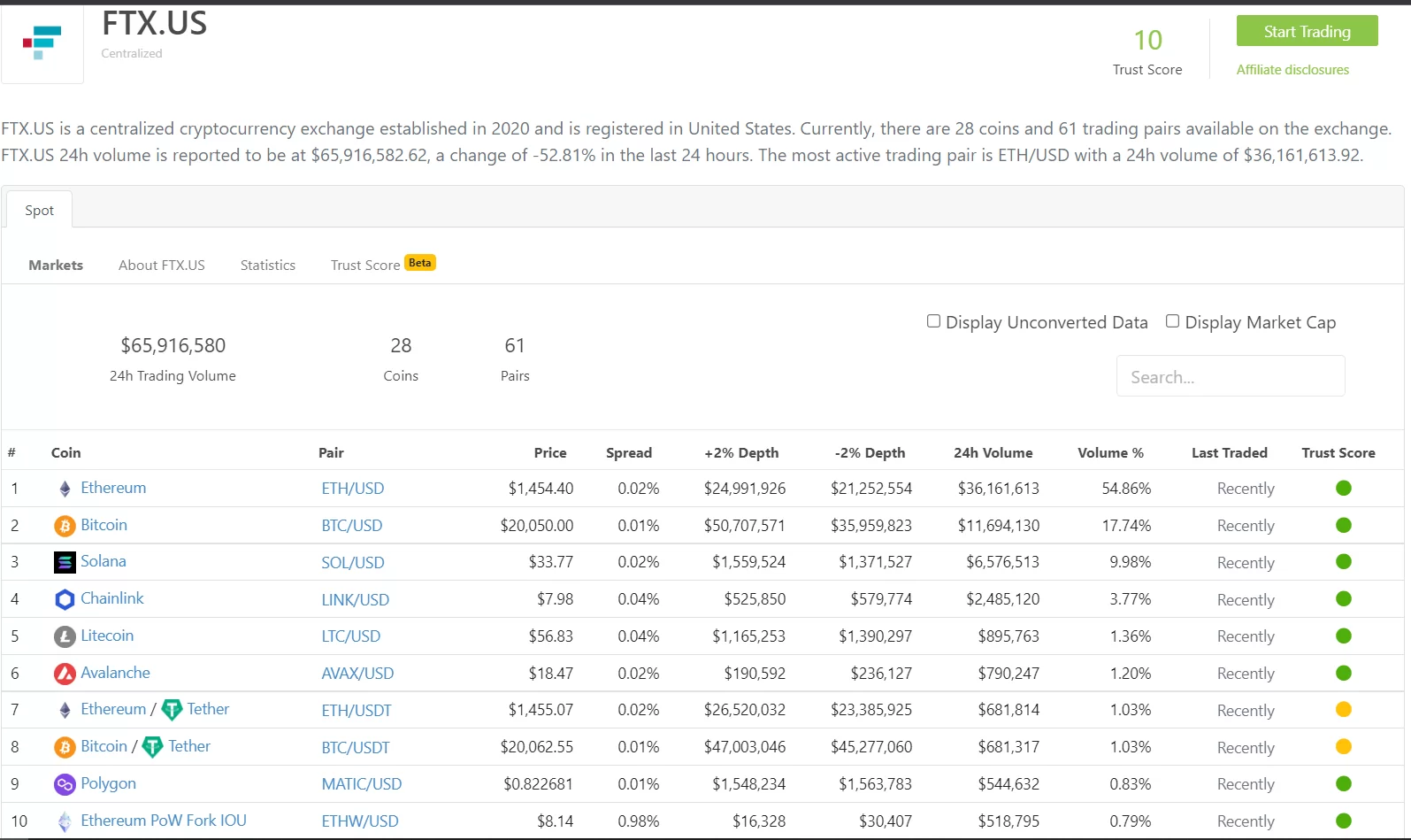 FTX.US borsasının spot piyasasının son 24 saatteki işlem hacminin %55’ini ETH/USD çifti oluşturdu. BTC/USD işlem çiftinin oranı ise %17’de kaldı. Bitcoin’i ise %10 ile sırasıyla Solana, Chainlink ve Litecoin takip ediyor.
