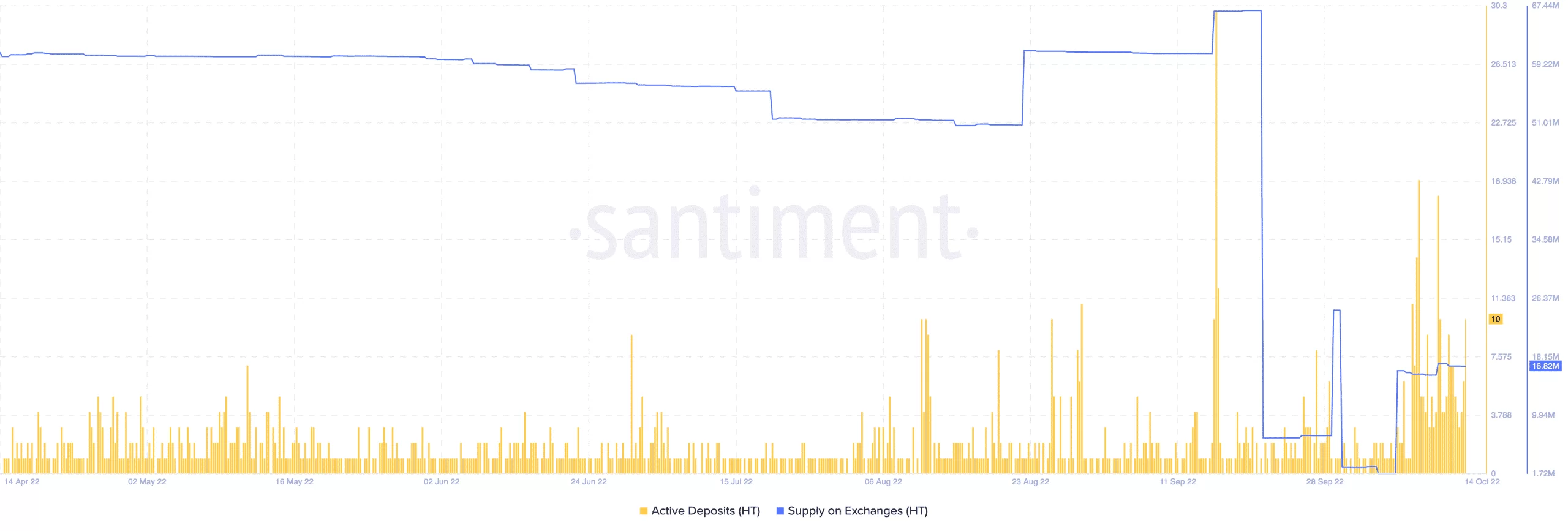 Aktif günlük cüzdan sayısındaki artış, HT tokenında tekrar hareketli günlerin yakında olduğunu gösteriyor olabilir. Santiment’in bir başka grafiği ise, borsalarda bulunan Huobi Token arzını gösteriyor.