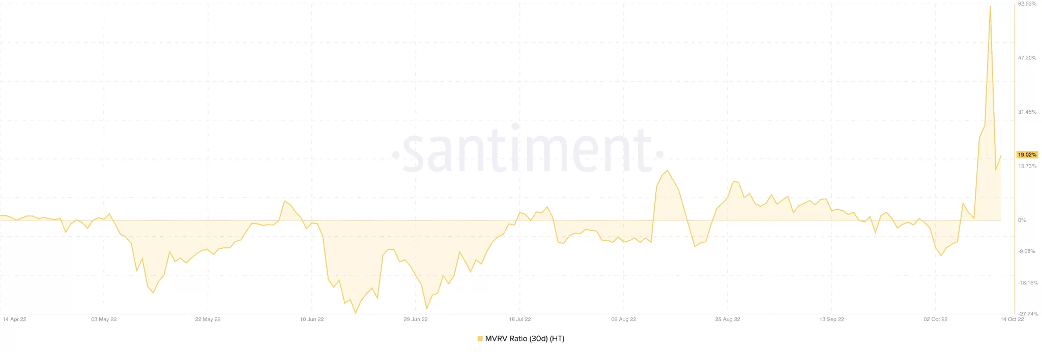 Yatırımcıların kâr-zarar tablosuna baktığımızda ise, çoğunun yüzünün güldüğü görülüyor. Santiment’in Market Value / Real Value (MVRV) verisi, son 30 günde HT alan yatırımcıların çoğunluğunun kârda olduğunu gösteriyor.
