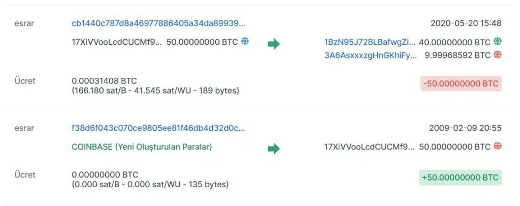 Bilindiği gibi Bitcoin’in ilk bloğu olan genesis blok 3 Ocak 2009 yılında kazıldı ve ilk Bitcoin üretilmiş oldu. Bu ilk üretimden yaklaşık 1 ay sonra üretilmiş olan (09.02.2009) 50 adet BTC’nin ilk defa hareket ediyor oluşu doğrudan Bitcoin kurucusu Satoshi Nakamoto ile ilişkilendirildi.