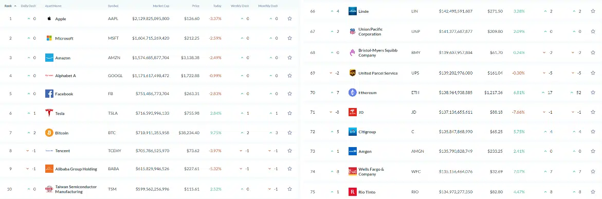 Bitcoin ve Ethereum piyasa değerleri itibariyle en büyük 100 varlık arasında çoktan yerini aldı. Bitcoin 710 milyar dolarlık piyasa değeri ile en değerli 100 varlık arasında 7. sıraya yükselirken, Ethereum’da 139 milyar dolarlık piyasa değeri ile 70 sıraya yükseldi.
