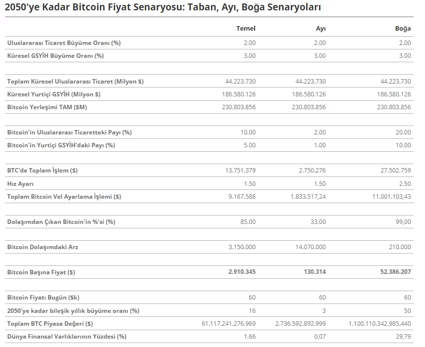 VanEck’in tahminleri Bitcoin’in 2050 yılına kadar dünya uluslararası ticaretinin %10’unu ve iç ticaretin %5’ini karşılayabileceğini temel alıyor. Şirket ayrıca merkez bankalarının varlıklarının %2,5’ini BTC‘de tutacağını öngörüyor.