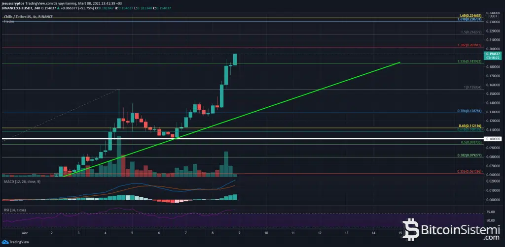 Yaşadığı yükselişlerin ardından günlük grafikte net bir öngörü yapılamazken, 4 saatlik grafikte fibonacci düzeltmesi uygulanabilir. Grafik üzerine yerleştirilen fibonacci seviyelerinin güzel bir şekilde işlediği görülüyor. Yayın saati itibariyle CHZ fiyatı, 0.184 dolar direncini desteğe çevirmeye çalışıyor.