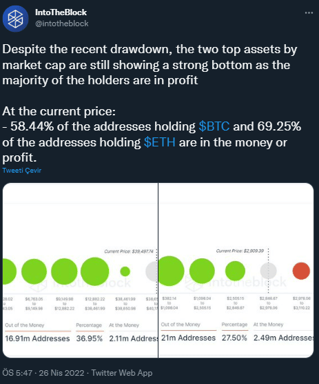 IntoTheBlock tarafından Ethereum kârlılık oranı ile ilgili paylaşılan en son verilere baktığımızda son düşüşe rağmen güçlü durduğu ve Ethereum tutan adreslerin %69,25’lik bir payın kârda olduğu görülmektedir.