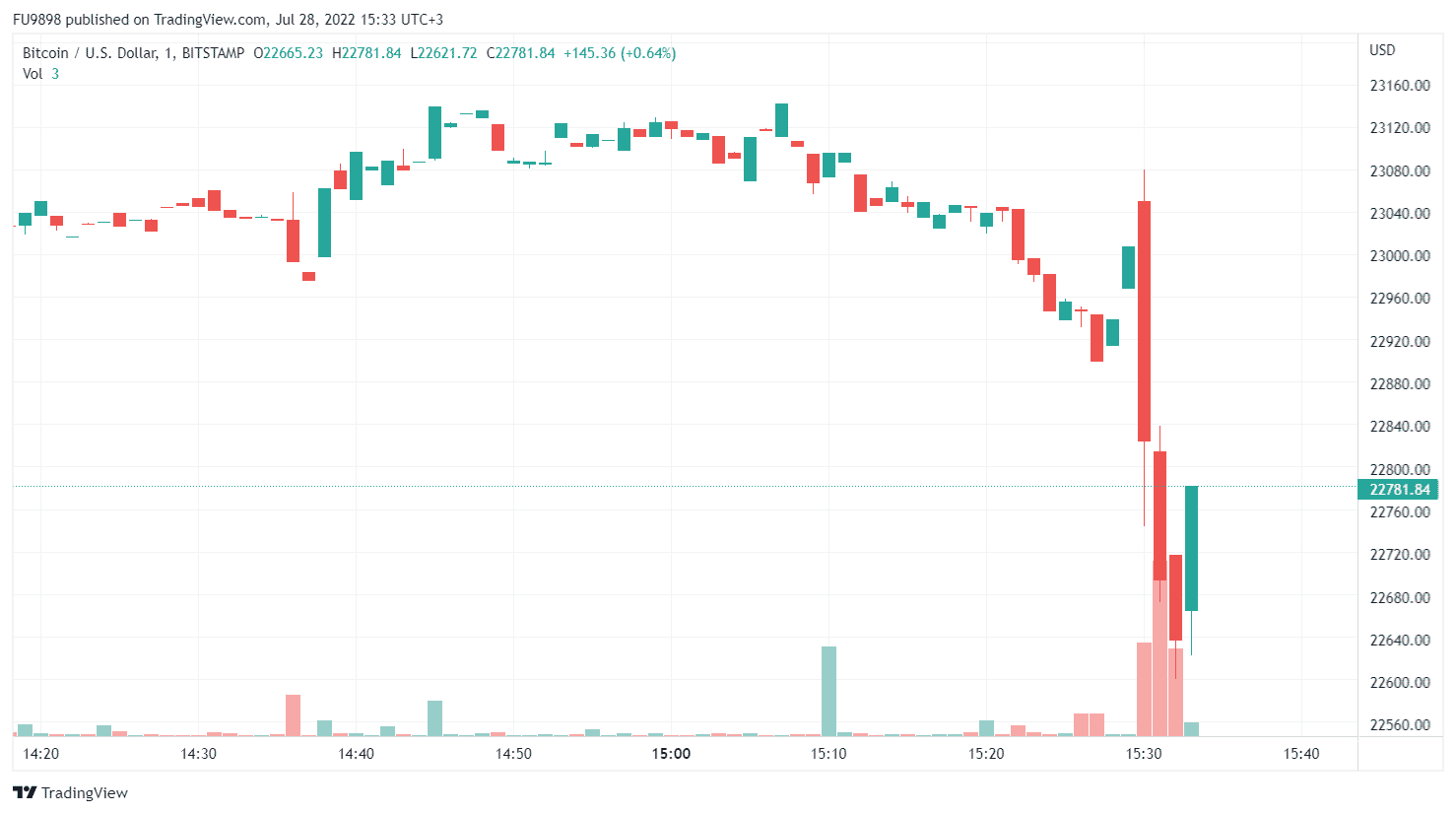Bitcoin fiyatı ilk etapta bu gelişmeye negatif bir tepki vermişe benziyor. Açıklamadan önce 23.000 doların üstünde seyreden BTC, açıklamayla birlikte 22.600 dolar seviyesine kadar çekildi.