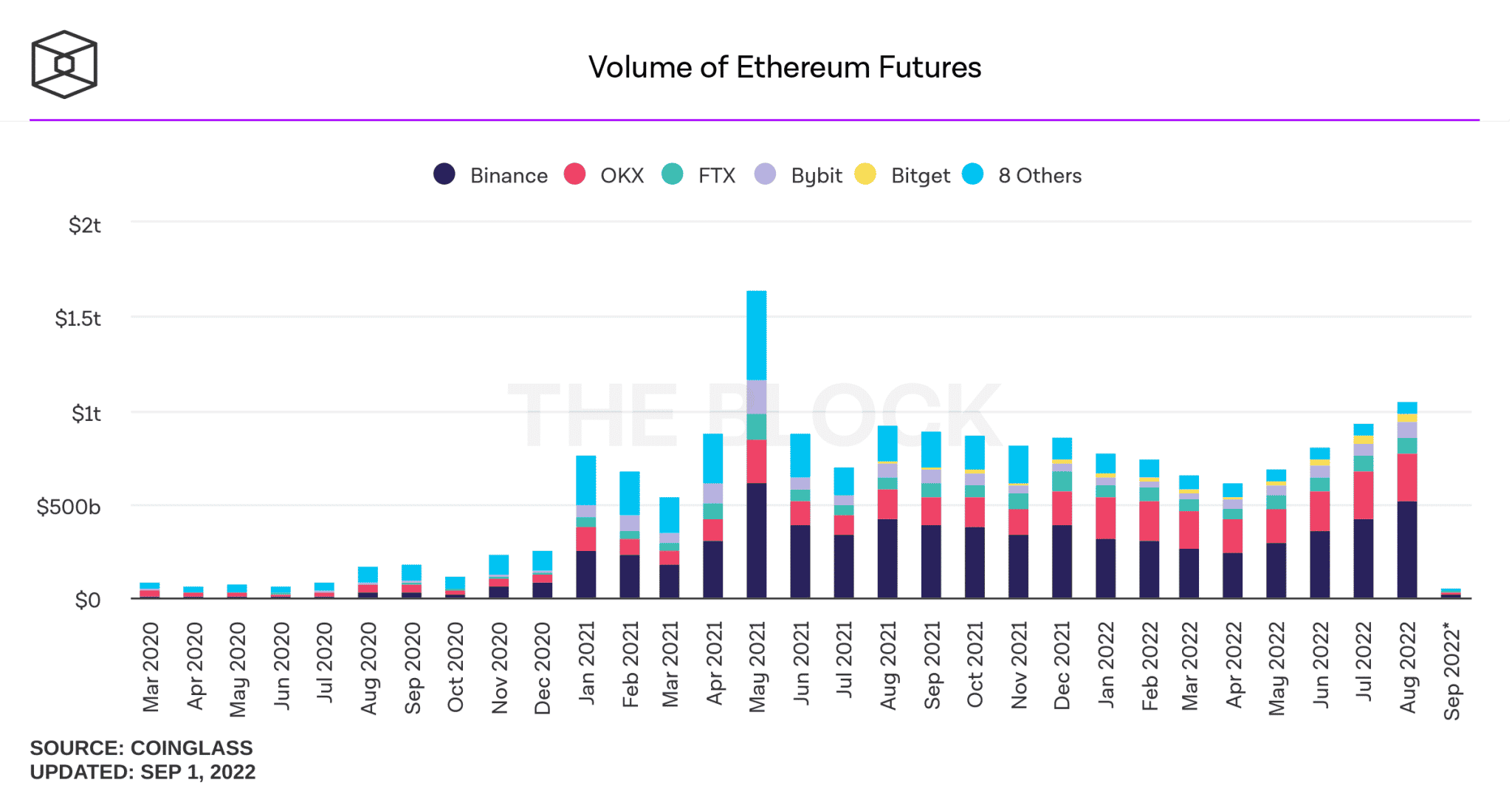 BTC’den sonra en büyük kripto para birimi olan Ethereum’da vadeli işlem hacimleri en son Mayıs 2021’de ayında 1 trilyon doları aşmıştı ve 1,64 trilyon dolara ulaşmıştı.