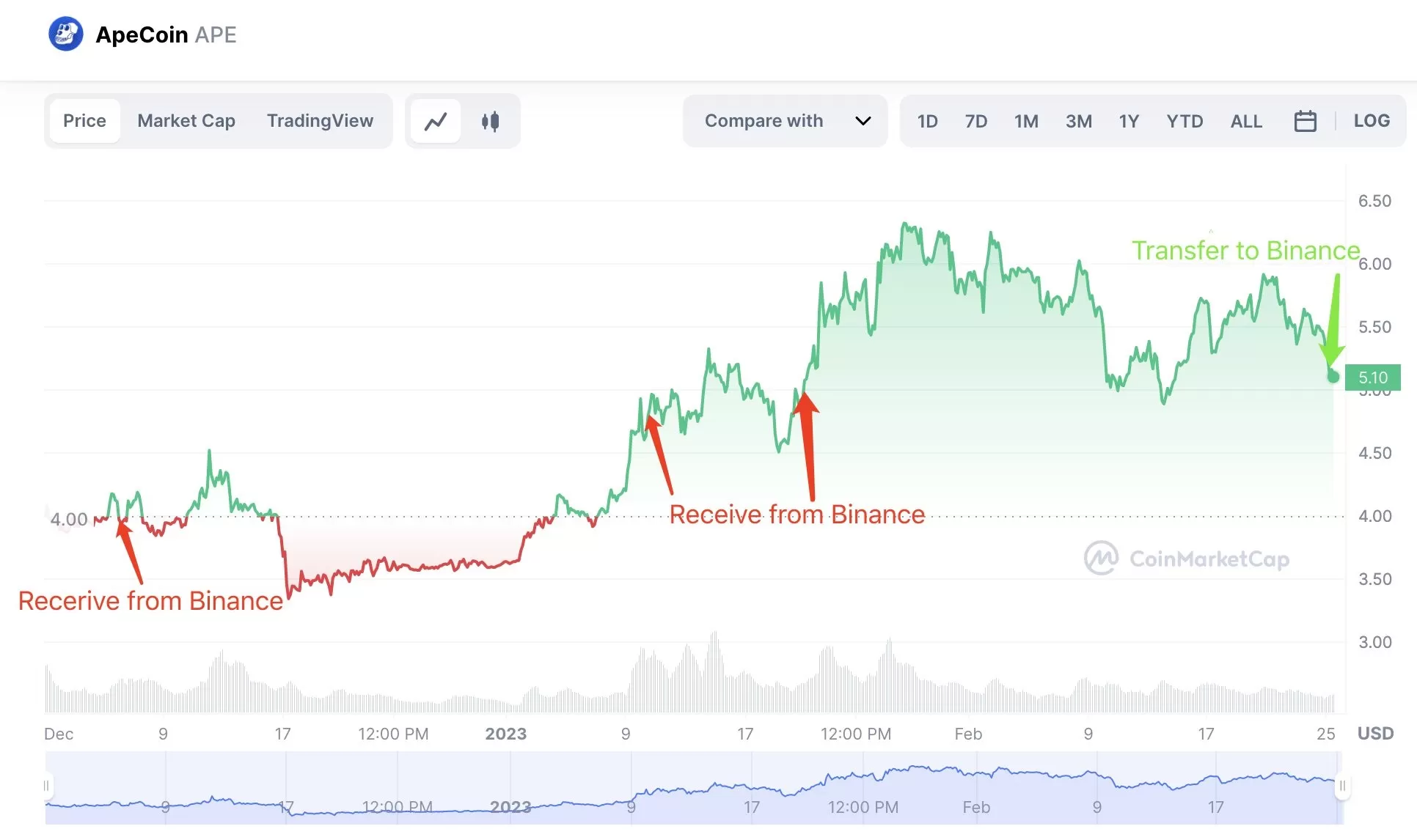 Balina adresi bu coinleri 6 Aralık 2022, 10 Ocak 2023 ve 20 Ocak 2020 tarihlerinde ortalama fiyat olarak 4.74 dolardan satın almıştı. Aynı balinanın cüzdanında mevcut durumda 131.222 APE daha bulunuyor.