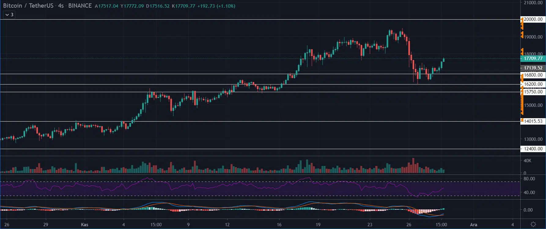Bakıldığı zaman BTC’de en önemli destek seviyelerinin sırasıyla 15.750, ve 14.000 dolar olduğu görülüyor. Özellikle 14.000 doların altında bir günlük kapanış yapılmadığı sürece büyük trendin hala yükseliş yönlü olduğunu ifade eden uzmanlar bu seviyenin altına düşülmesiyle trendin düşüş yönüne geçebileceğini savunuyor.