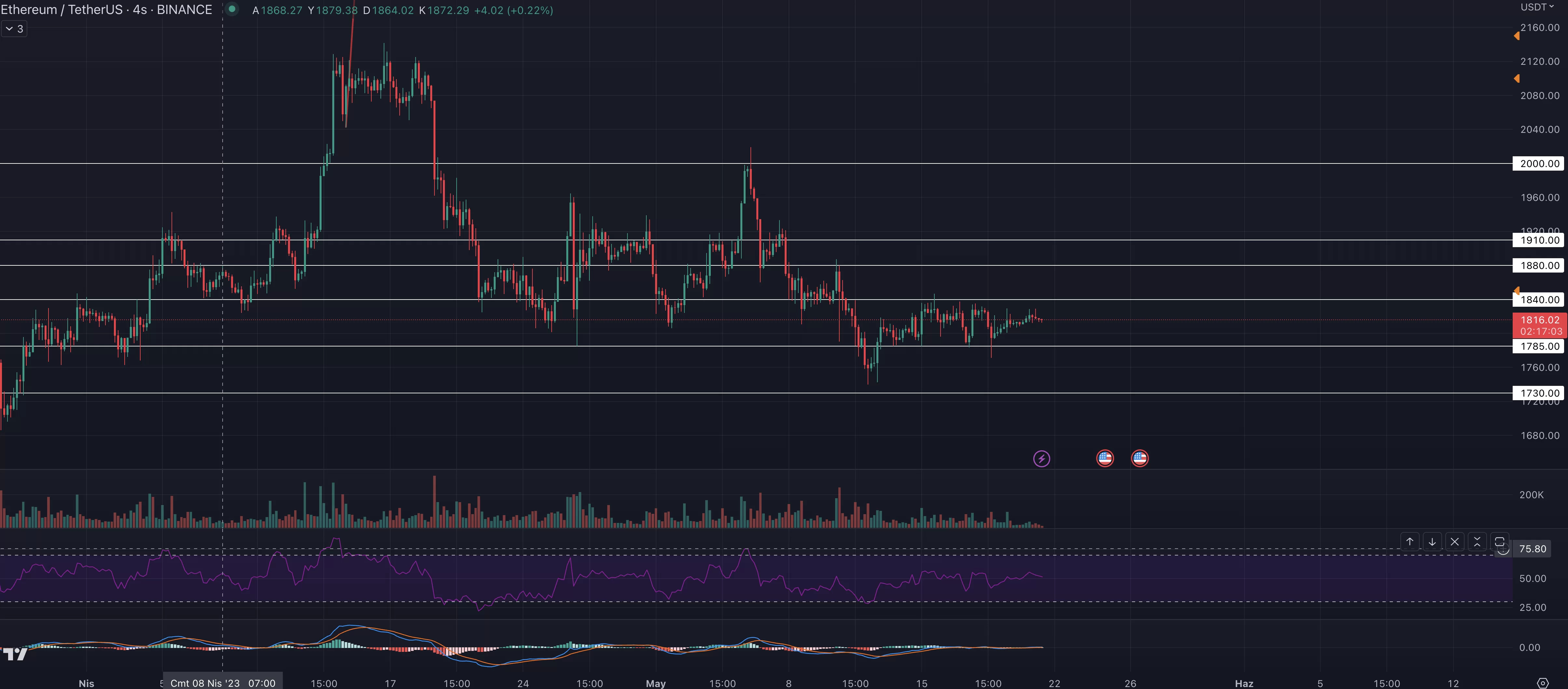 Ethereum tarafına baktığımızda ise ilk olarak en önemli direnç noktasının 1840 dolar olduğu görülüyor. Bitcoin’in de yukarı yönlü hareket ettiği durumda bu direnç noktasını kıran ETH, tekrar 1900 dolar seviyelerine kadar yükseliş yaşayabilir.