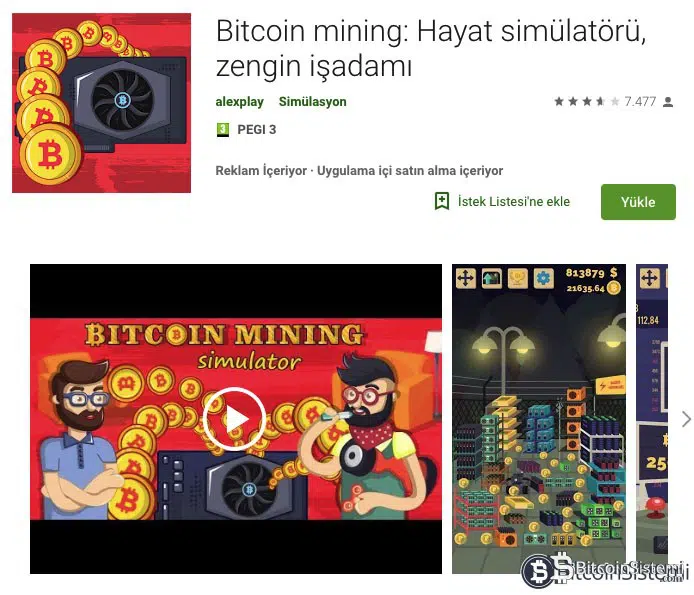 Yine bu uygulama Rus bir geliştirici tarafından özel olarak geliştirilmiştir. Türkçe’ye çevrilmiş olan adı ‘Bitcoin mining: Hayat simülatörü, zengin işadamı’ olarak yazılan uygulamanın Rusya merkezli olarak geliştirilmesinin dışında ”Bitcoin madenciliği oyunu” olarak geçiyor olması akıllarda ”madencilik dolandırıcılığı” iddiasını bir kez daha getiriyor. Oyunda asıl amacınız madencilik yapmak çok daha fazlasını kazanmak olsa bile oyun reklamlar içeriyor ve kullanıcıların yazdıklarına göre her 5 dakika içerisinde tam 5 oyun içi reklam görmek zorunda kalıyorsunuz. Bu reklamlar gerek internet üzerinden gelen reklamlar, gerek oyunun kodları arasına yerleştirilmiş olan web adreslerine yönlendirme yapılan reklamlar olurken kripto para dolandırıcılığı şüphesini son derece fazla taşımakta.