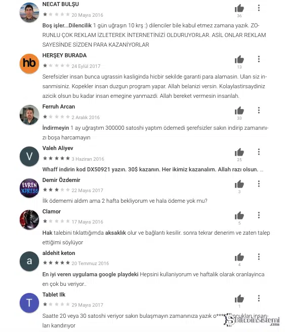 Maalesef ki Play Store’da bulunan uygulamaların bir kısmında insanların yorumları bile okumadan sadece ”cihazda dursun, para kazanacağım onlar benim kazanmamı istemedikleri için böyle yorumlar yapıyorlar” düşüncesi ile bu ve bundan daha kötü uygulamaları indirdiklerini bilmek acı ama gerçek. Free Bitcoin adındaki uygulama ile ilgili şikayetler son derece fazla olsa da dolandırıcılık amaçlı bir uygulama olduğunu iddia edenlerin sayısı kadar, gerçek olduğunu iddia eden ve para aldığını iddia eden Avrupa merkezli yorumlarda mevcut. Bu yorumlar arasında Türkçe yapılan yorumlara bakıldığında ise;