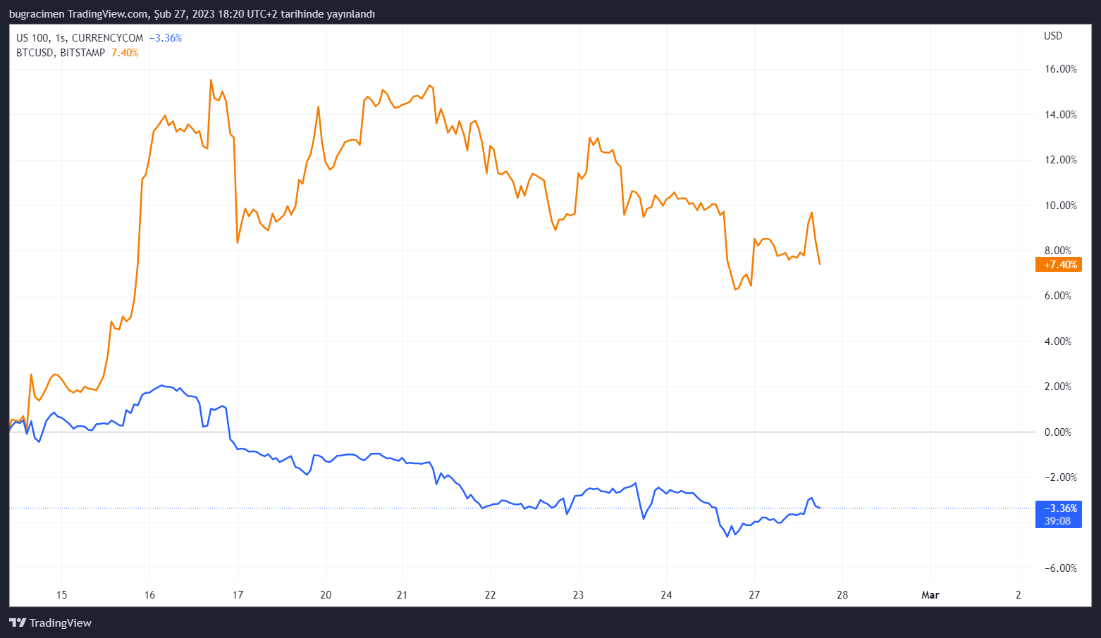 Kripto paraların atası Bitcoin ile teknoloji ağırlıklı hisse senedi endeksi Nasdaq’ın geçtiğimiz yıl korele hareket ettiğine şahit olduk. Ancak Şubat ayının ikinci yarısından itibaren iki yatırım ürünü zıt yönlerde seyrediyor.