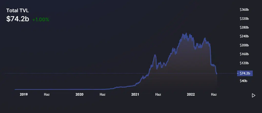 Tüm DeFi sektörü düşünüldüğünde ise toplam kilitli değer miktarı 74.2 milyar dolar seviyesine çekildi. DeFi dünyasının toplam kilitli değer miktarı geçtiğimiz yılın Aralık ayında 250 milyar doları aşmıştı. Sektördeki gerilemenin önemli bir kısmı kripto para sektöründeki büyük düşüş ile paralel olarak gerçekleşti.