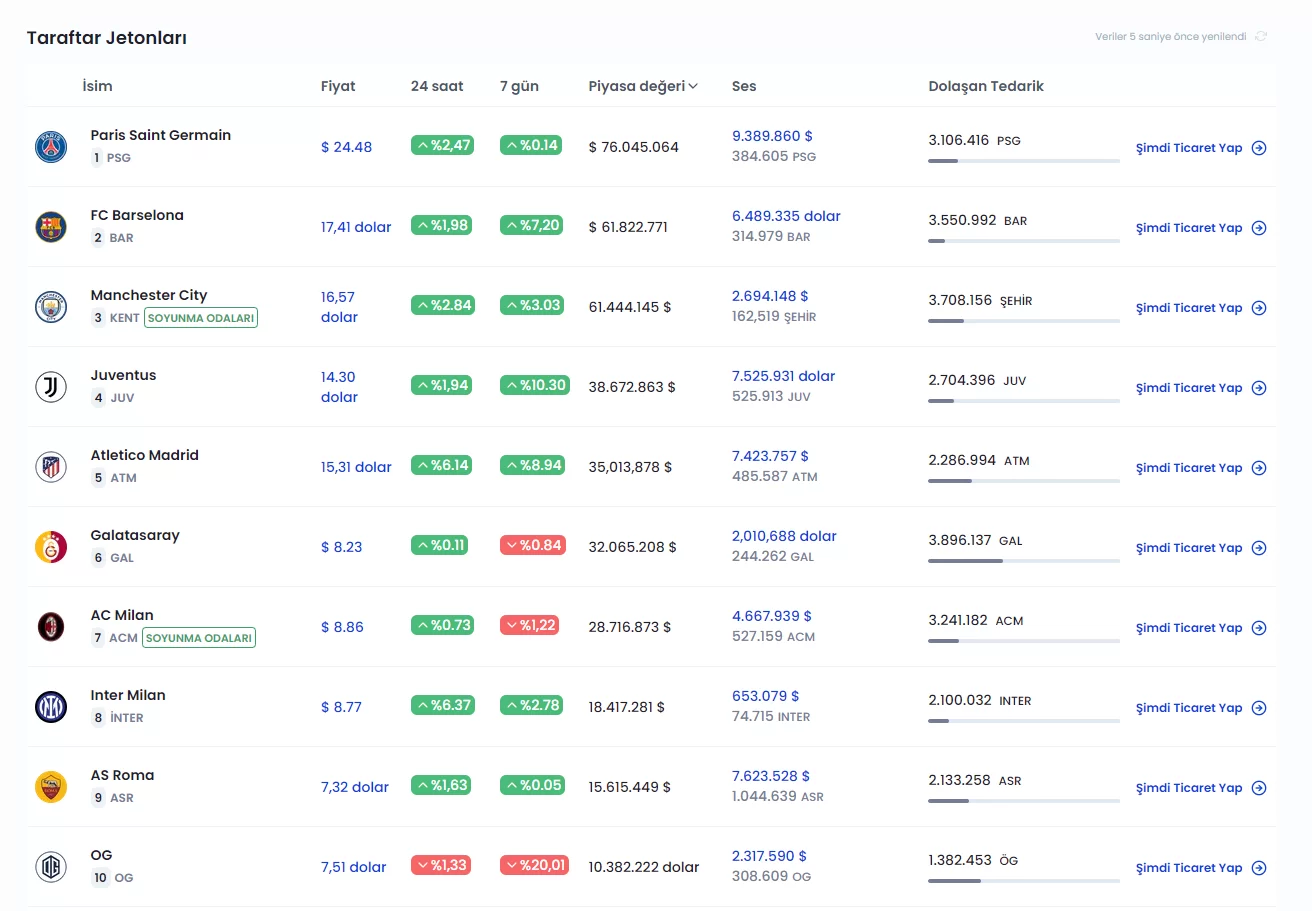 Fanmarketcap verilerine göre, piyasa değerine göre ilk 10’da yer alan fan tokenlerin haber saatimiz itibariyle 24 saatlik ve 7 günlük değişimleri şu şekilde: