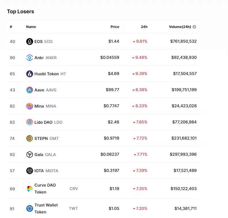 İlk 100 coin arasında son 24 saatte en çok kaybettirenler ise şu şekilde: