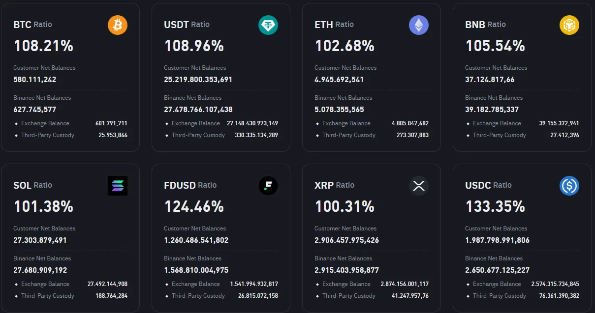 Binance’in son rezerv kanıtı, azalan varlıklara rağmen BTC, USDT ve ETH rezervlerinin sırasıyla %108,21, %108,96 ve %102,68 oranında aşırı teminatlandırılmış olarak kaldığını gösteriyor.
