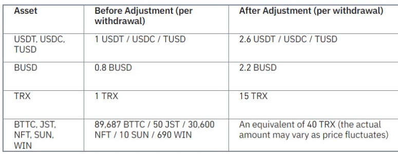 BUSD para çekme ücreti 0,8BUSD’den 2,2BUSD’ye; TRX para çekme ücreti ise 1TRX’ten 15TRX’e yükseltildi.