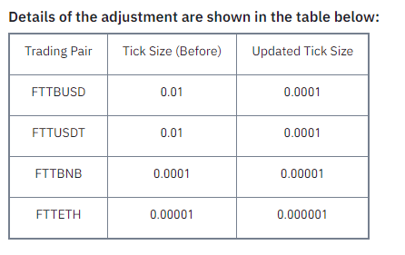 Bu düşüşten sonra Binance borsası FTX ile ilgili bir güncelleme yapacağını duyurdu. Güncelleme ile FTX paritelerinde noktadan sonra artık daha fazla sayı görünecek. “Tick Size” olarak isimlendirilen bu kavramın güncellenmesi ile beraber FTX’in USDT paritesine, noktadan sonra 2 dijit daha eklenecek.