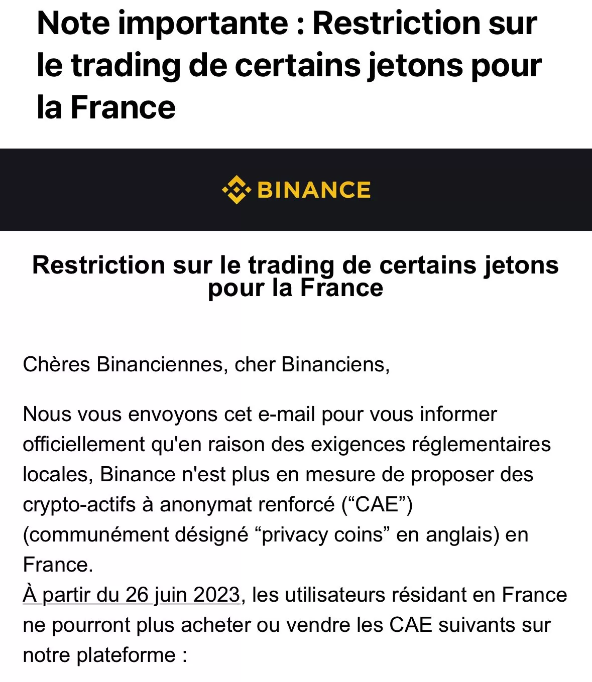 Binance’in Fransız müşterilerine gönderdiği bir e-posta’da bazı yasal gerekçeler nedeniyle Fransa’da ikamet eden kullanıcılara gizlilik parası olarak bilinen altcoinlerin satışının durdurulacağı bildirildi.