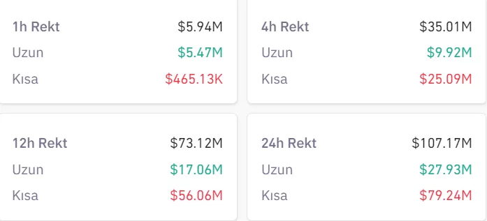 Bu noktada Coinglass’tan alınan verilere göre son 24 saatte kaldıraçlı pozisyonlardaki 107 milyon dolar değerinde işlem likidasyona uğrayarak tasfiye oldu.