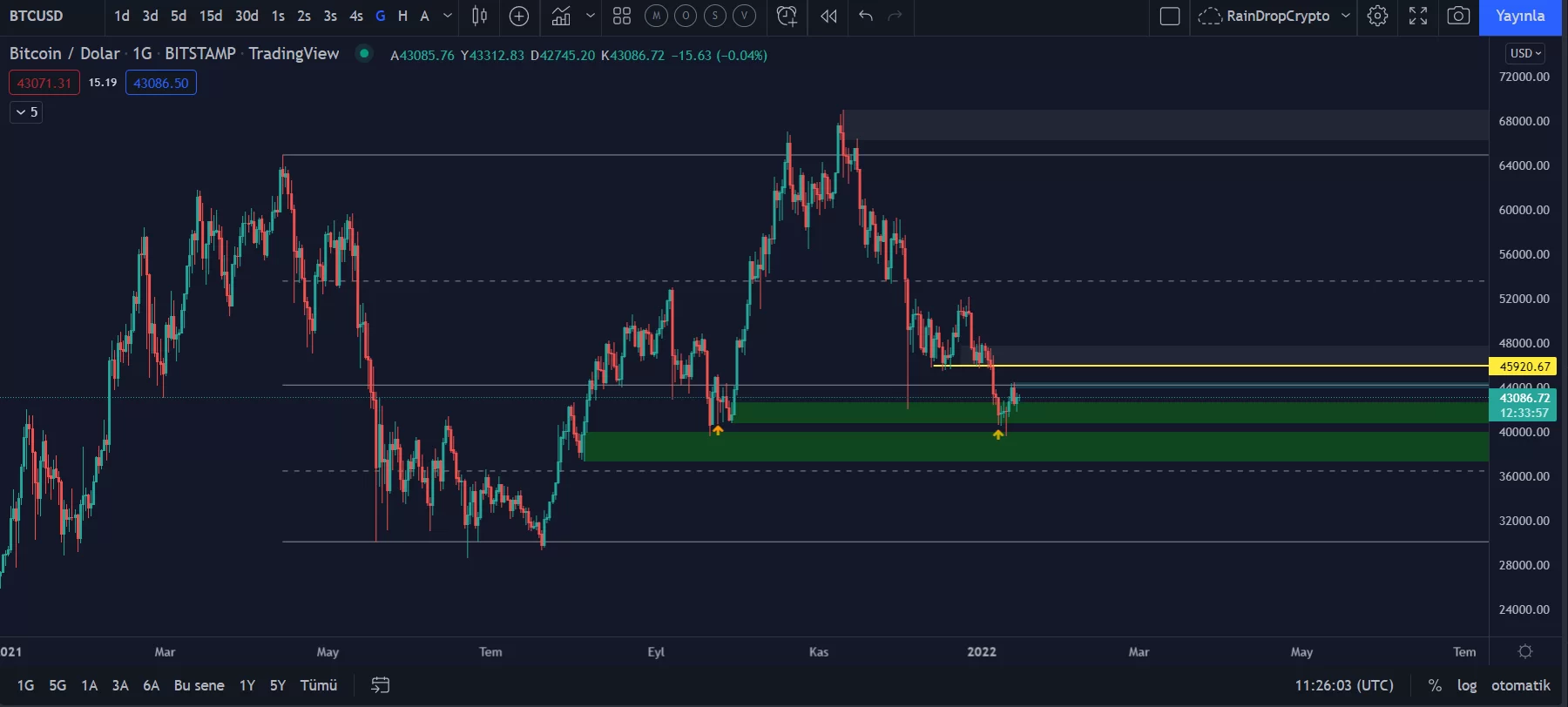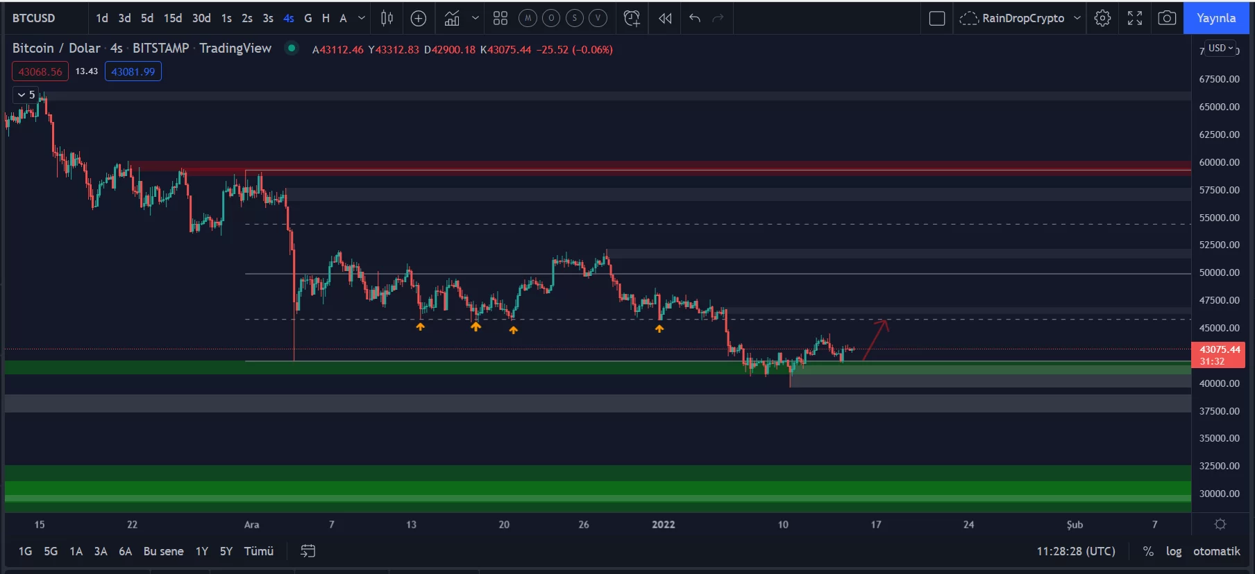 Bu bölgeden aldığı tepki ile beraber yönünü yukarı doğru çevirerek 44.000 dolar direnç seviyelerine kadar tepki yükselişini gerçekleştirdi.