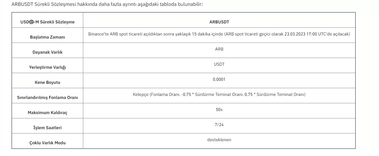 ARB için 50 kata kadar kaldıraçlı işlem başlattıklarını duyuran Binance, ARB için vadeli işlemlerin spot ticaret açıldıktan sonra yaklaşık 15 dakika içimde başlayacağını belirtti.
