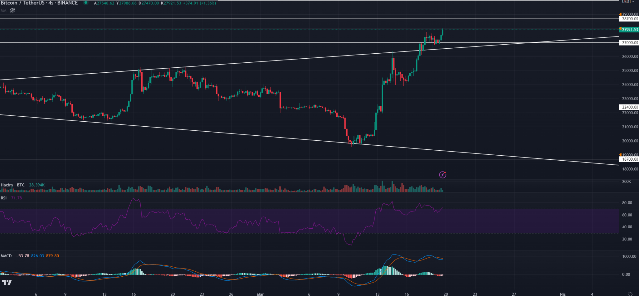 Normalde hafta sonlarını hacimsiz ve sakin geçiren Bitcoin, bugün de yükselişlerine devam etti. 28.000 doları gören BTC, 12 Haziran 2022’den beri en yüksek seviyesini görmüş oldu.