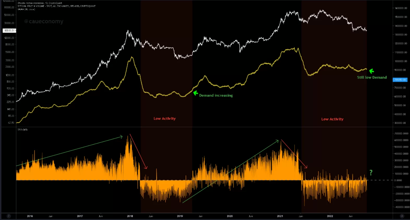 On-chain metriklerini derleyen CryptoQuant’ın verilerine göre, BTC ağındaki aktivite istenen seviyeye bir türlü ulaşamıyor. CryptoQuant araştırmacıları, ağdaki aktif cüzdan adreslerinin fiyat ile karşılaştırıldığı yeni bir grafik yayınladı.