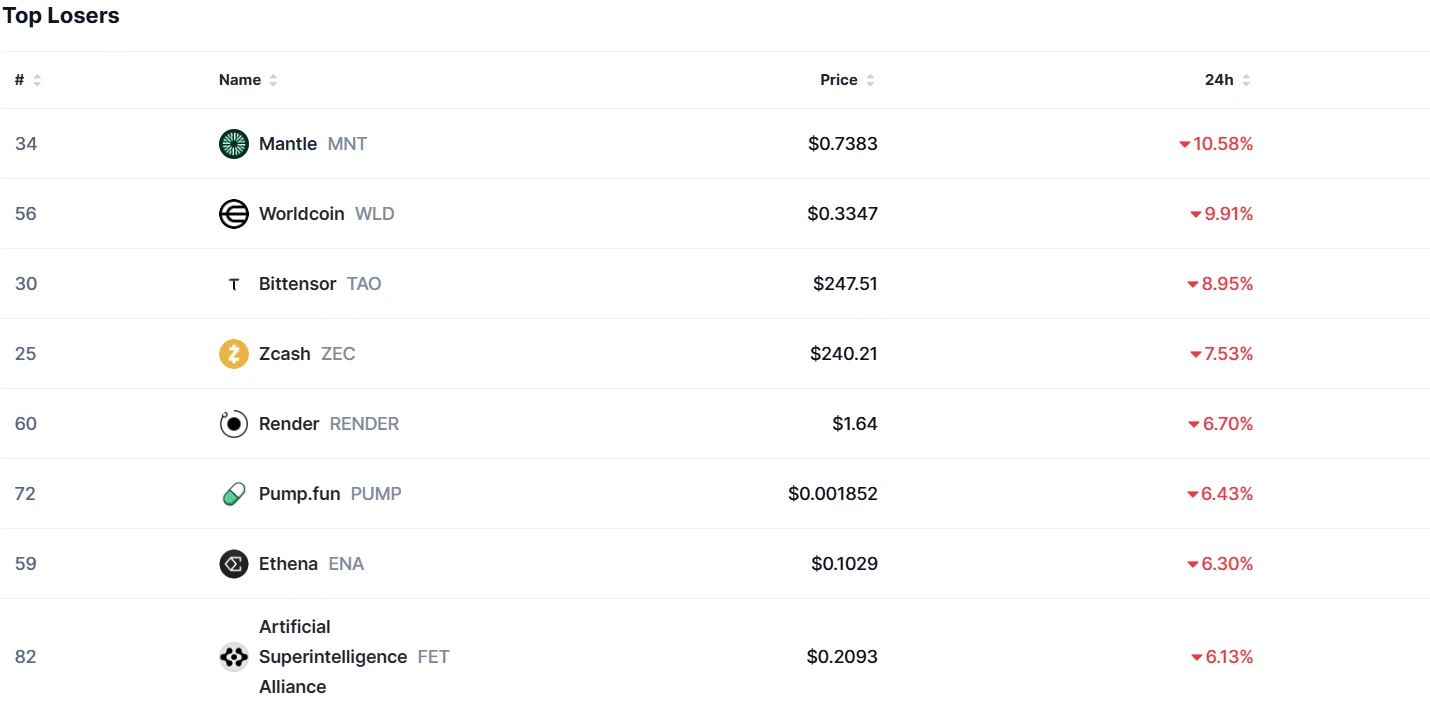 Coinmarketcap verilerine göre, son 24 saatte en çok kaybedenler ise şu şekilde sıralandı: 1. sırada %10,5 kayıpla Mantle (MNT), 2. sırada %9,9 kayıpla Worldcoin (WLD), 3. sırada %8,9 kayıpla Bittensor (TAO), 4.sırada %7,5 kayıpla Zcash (ZEC) ve 5 .sırada ise %6,7 kayıpla RENDER bulunuyor.