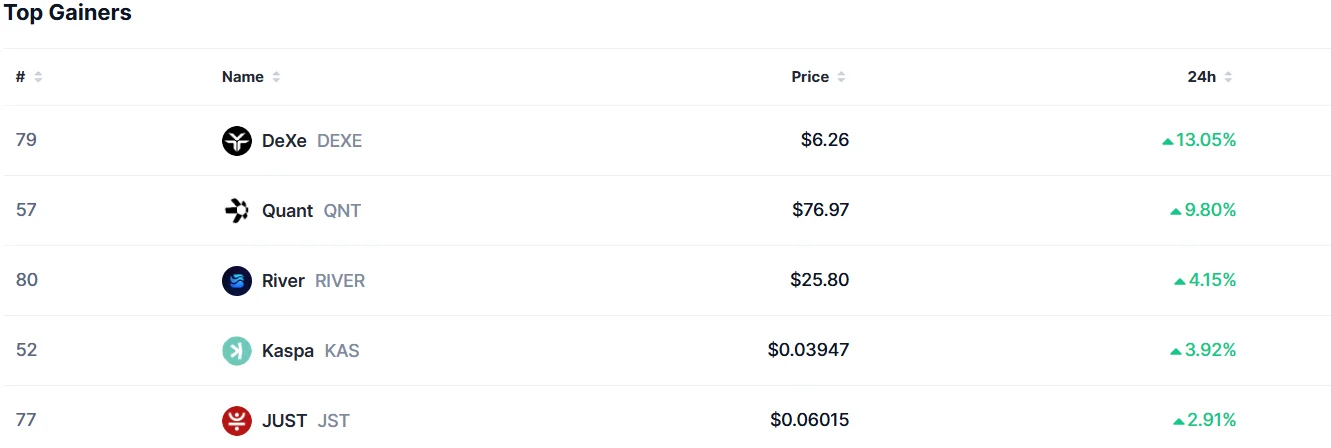 CoinMarketCap verilerine göre, DEXE %13,05; QNT %9,8, RIVER %4,1, KAS %3,9 VE JST %2,9 artışla en çok kazandıran ve piyasadan pozitif ayrışan altcoinler arasında yer aldı.