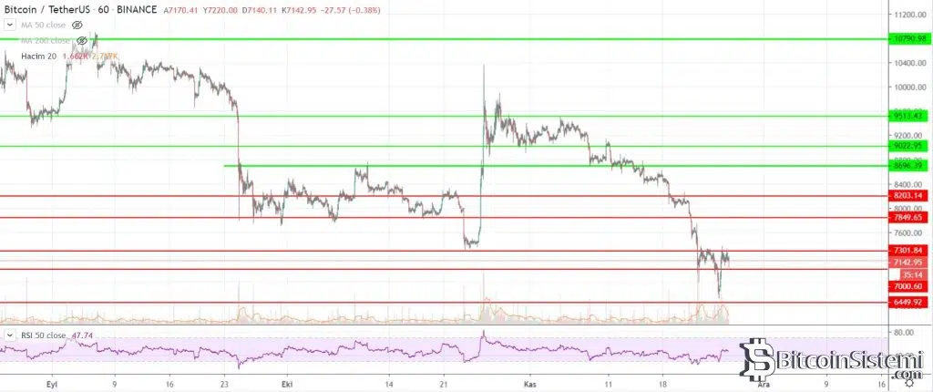 Saatlik grafiğe bakıldığında ise bu aşamada BTC’nin dip noktasının 6450 dolar olduğu görülüyor. Bu seviyenin altına inilmesi durumunda 5000 dolarlı seviyelere gerileme olabileceğini ifade eden uzmanlar, direnç noktaları olarak ise 7300, 7850, 8200 ve 8800 seviyelerini işaret ediyor.
