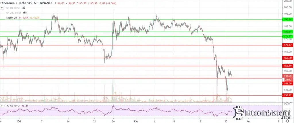 Saatlik grafiğe bakıldığında ise birkaç gün önce 131 dolar seviyelerine kadar düşen ETH fiyatında en önemli destek 130 dolar olarak karşımıza çıkıyor. An itibarı ile 145 dolar seviyelerinde işlem gören Ether, 153, 160 ve 170 dolar seviyelerinde direnç noktalarıyla karşımıza çıkıyor.