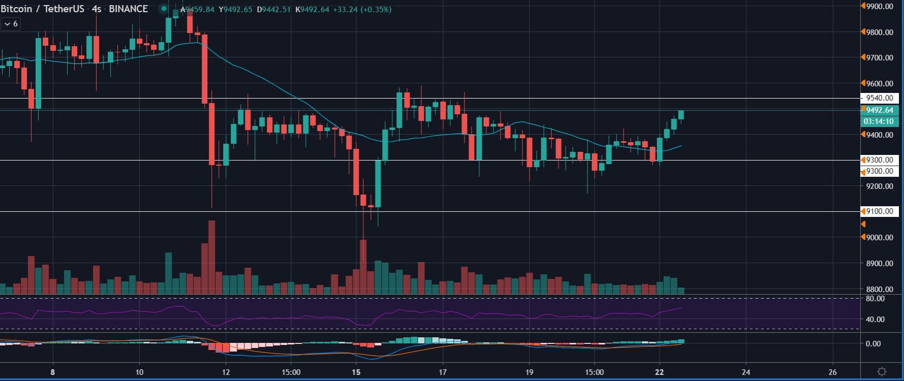 4 saatlik periyotta ise fiyatın uzun zamandır 9300 – 9600 bandı arasında yatay hareket ettiği görülüyor. Geçtiğimiz günlerde 9100 dolar altına düşüş yaşanmış olsa da bu seviye üzerinde tutunmayı başaran BTC, daha sonra tekrar yukarı yönlü olarak hareket etti. Bu periyotta özellikle 9100 dolar seviyeleri destek olarak görülürken direnç seviyesi yine 9540 dolar seviyeleri olarak karşımıza çıkıyor.