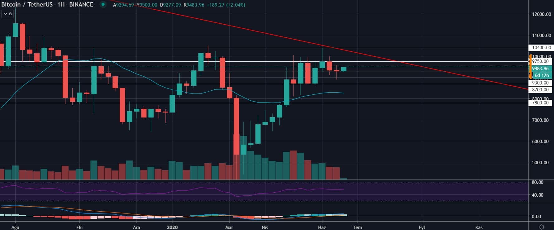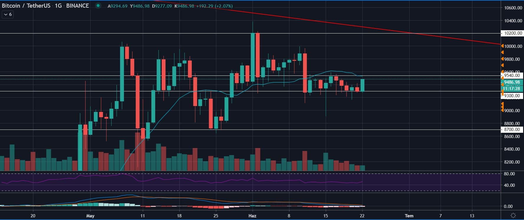 Ara destek ve dirençleri görebilmek için daha küçük periyotlara inip 1 günlük grafiğe baktığımız zaman, 9550 dolar seviyeleri hem 20 MA (20 günlük hareketli ortalama) hem de bu periyotta direncin geçtiği seviyeler olarak karşımıza çıkıyor. Bu seviyenin geçilmesi özellikle de günlük olarak üzerinde kapanış olması durumunda “yön yukarı yönlü oldu” diyebiliriz.