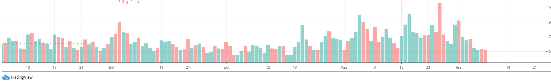 Bildiğiniz üzere tepe bölgesinde hacmin azalması, boğanın bitişi ve düşüş anlamına gelebiliyor. Bu bakımdan BTC‘de son 4 günlük hacim verileri çok da iç açıcı görünmüyor. Ayrıca yatırımcıların sıklıkla kullandığı TD Squental indikatörü haftalık ve aylık bazda 9. mumu yaktı. TD Squental’da 9. mum genel olarak dönüş mumu olarak yorumlanıyor.