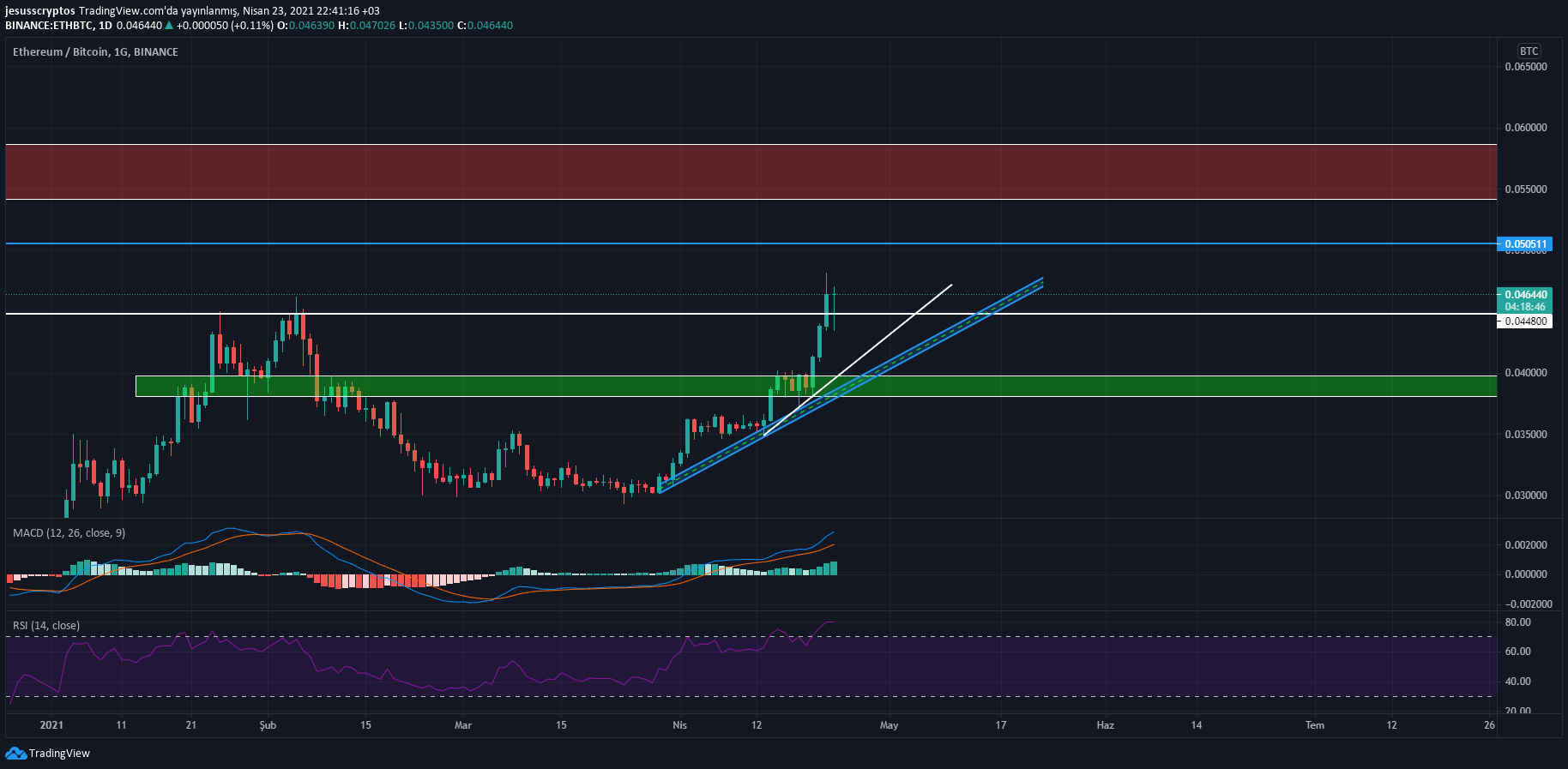 Burada USDT paritesinden ziyade BTC paritesine değinmek istiyoruz. ETH/BTC paritesi, piyasada BTC yatırımcılarının parasını nakde mi yoksa daha çok ETH’ye mi çevirdiği yönünde az çok bir bilgi edinmemizi sağlıyor. Bu bağlamda son zamanlarda BTC’ye karşı değerlenen ETH, bu parite üzerinden önemli bir seviye olan 0.0448’in üzerine çıkmayı başardı.