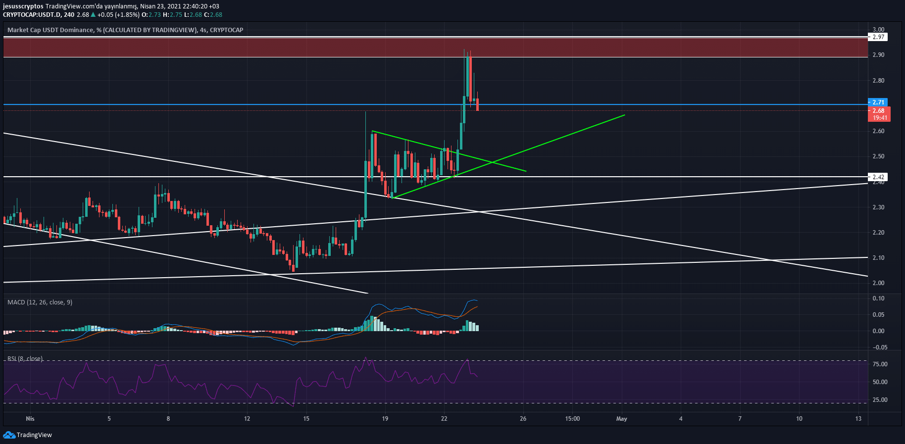 Bitcoinle ilgili ilk olarak 18 Nisan günü gerçekleşen bir yükselen kama kırlımından bahsedebiliriz. Şubat ayındaki yükselişle birlikte oluşmaya başlayan yükselen kama formasyonu, fiyatta aşağı yönlü kırlımla sonuçlandı. Bu formasyonun düşüş hedefi olarak 44.800 dolar civarı gösterilirken fiyatın şimdilik en düşük 47.500 dolara değdiği görülüyor.