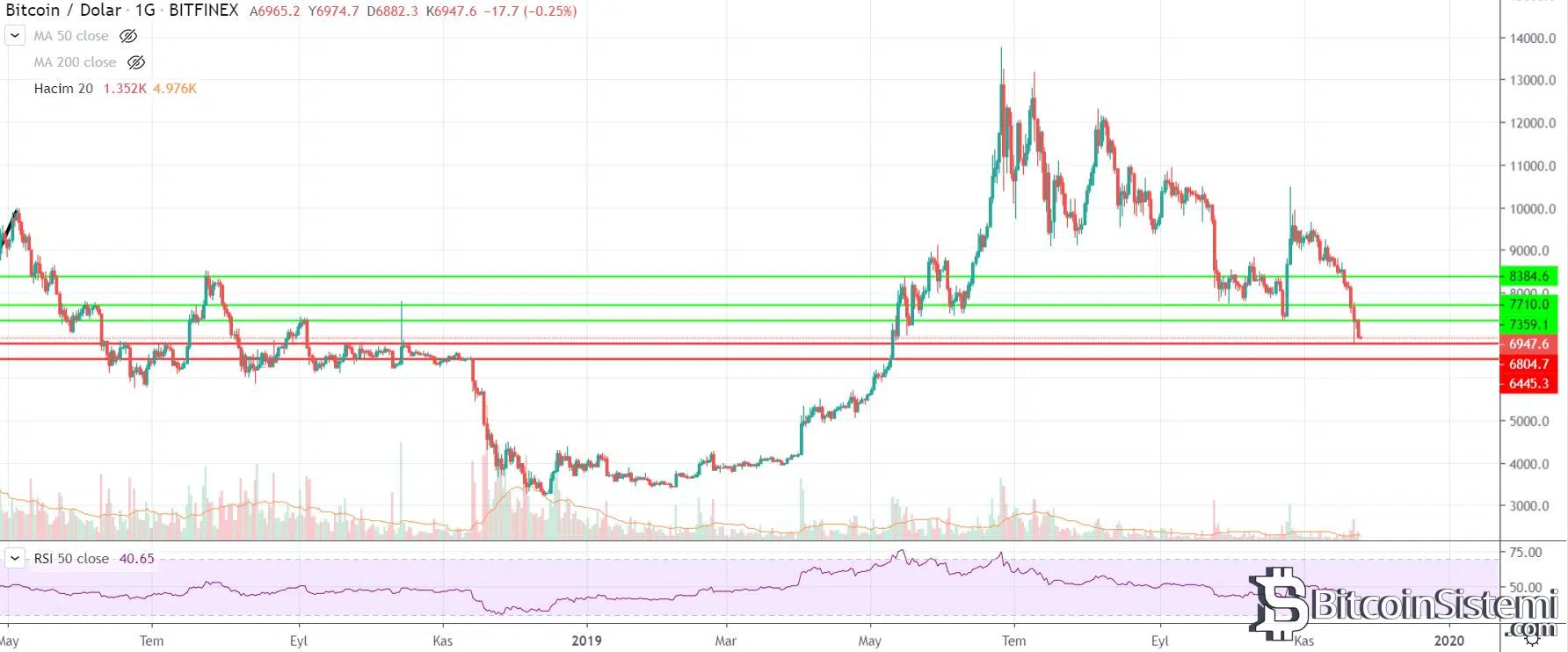 6800 doları görmesinden sonra 6900 dolara toparlayan fiyat, son zamanlarda ikinci kez bu destek seviyesini test etti. An itibarı ile 6800 dolar seviyesinden sonra en önemli destek seviyesinin 6450 dolar olduğunu ifade eden uzmanlar, BTC’deki satış baskısının devam etmesi ve bu seviyelerde çok fazla kalınması durumunda 6800 desteğinin kırılacağını düşünüyor.