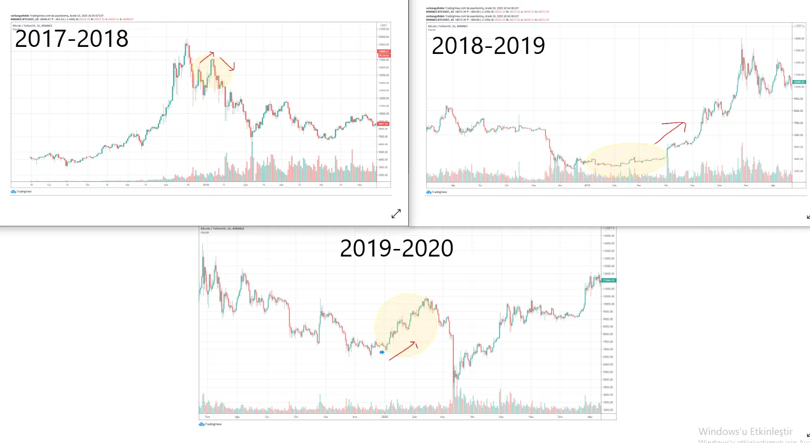 Görüleceği üzere yıl dönümlerinden sonra Bitcoin’deki genel olarak bir yükseliş hareketi gözlemlenmiş.