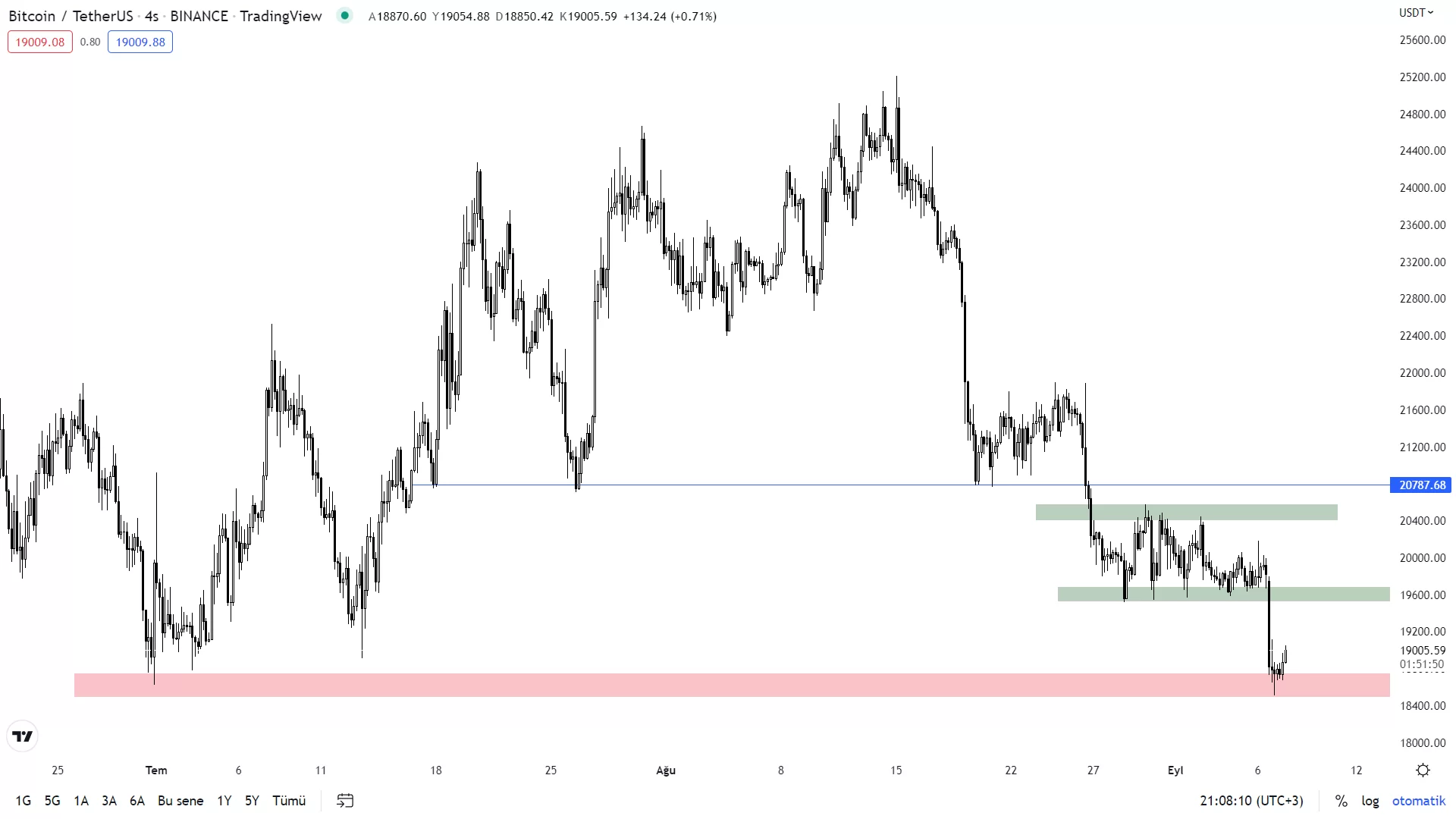 Bitcoin, kırmızı renk ile belirtilen 18.500-18.750$ seviyesinin altına sarkarksa satışlar hızlanabilir.