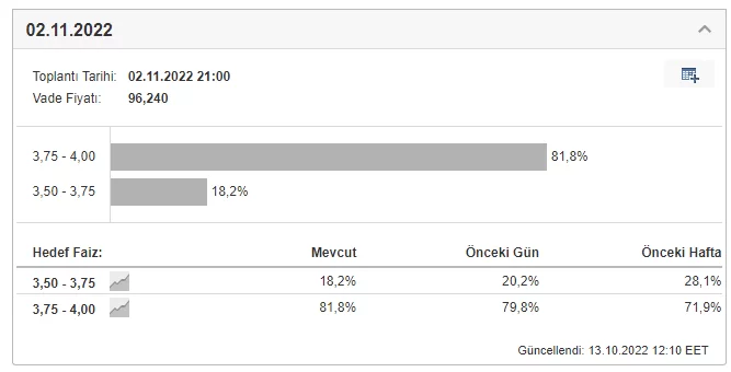 Kritik enflasyon verisi öncesi Kasım ayı FED toplantısındaki faiz artırım beklentisinin %81 oranında 75 baz puan olduğunu görüyoruz.