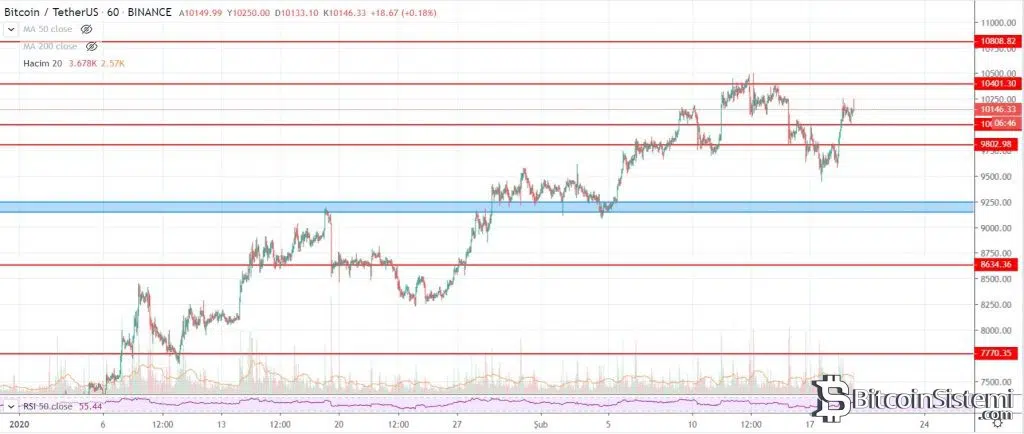Şüphesiz Bitcoin halving olayının fiyatlanmasının görüldüğü bu son günlerde en önemli direnç seviyesi daha önce de kırılamayan ve buradan aşağı seken 10.400 dolar seviyeleri. Eğer 10.400 dolar seviyesi geçilirse BTC yakın zamanda 11.800 ve 12.500 dolar seviyelerine kadar bir yükseliş yaşayabilir.