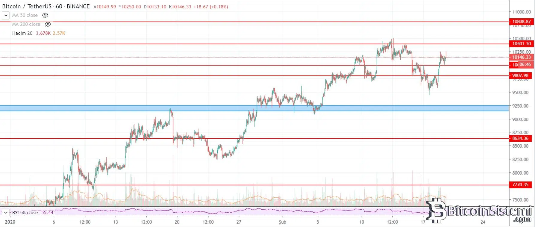 Şüphesiz Bitcoin halving olayının fiyatlanmasının görüldüğü bu son günlerde en önemli direnç seviyesi daha önce de kırılamayan ve buradan aşağı seken 10.400 dolar seviyeleri. Eğer 10.400 dolar seviyesi geçilirse BTC yakın zamanda 11.800 ve 12.500 dolar seviyelerine kadar bir yükseliş yaşayabilir.