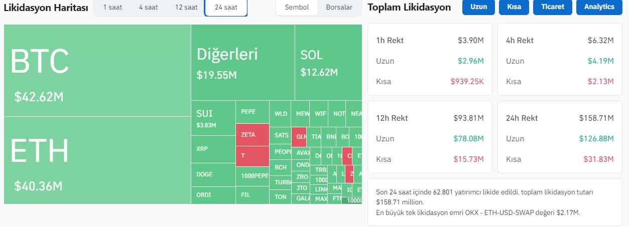 Piyasadaki bu düşüş çok sayıda long pozisyonun tasfiye dilmesine neden oldu. CoinGlass verilerine göre son 24 saatte 158,7 milyon dolar kaldıraçlı işlem tasfiye oldu. Bunların 126,8 milyon doları long pozisyonlardan 31,8 milyon doları ise short pozisyonlardan oluştu.